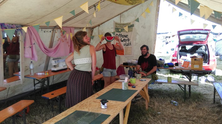 Auch auf dem Fusion Festival in Lärz haben wir unsere Zelte aufgeschlagen. In der Oase, die jedes Jahr vom Ikuwo und Sobi Rostock organisiert wird, hatten wir unser eigenes Nähzelt eröffnet. Die Nähmaschinen liefen in Dauerschleife und viele coole Sachen wie praktische Hüfttaschen, Flaschenhalter und anderes Festival Equipment sind entstanden.