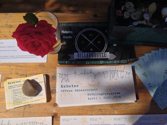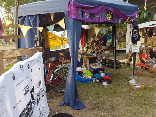 Im Juni sind wir mit dem Fahrrad (leider noch ohne Nährad) zum Monis Rache Festival in Tutow gefahren. Direkt neben der Schnapskiste und dem Frisör und gegenüber vom Siebdruckstand hatten wir den besten Standort um den Besucher_innen das Nähen beizubringen. Entstanden sind Schlauchschals, Bananen-Gürteltaschen, Schlauchtops und dieser fantastische Rucksack mit "All Clits are Beautiful" Print von Siebfreak und Roy aus Schwerin. Charly hatte auch seinen Sonnenbrillen- und Westenverleih dabei, der viele Leute sehr glücklich gemacht hat.